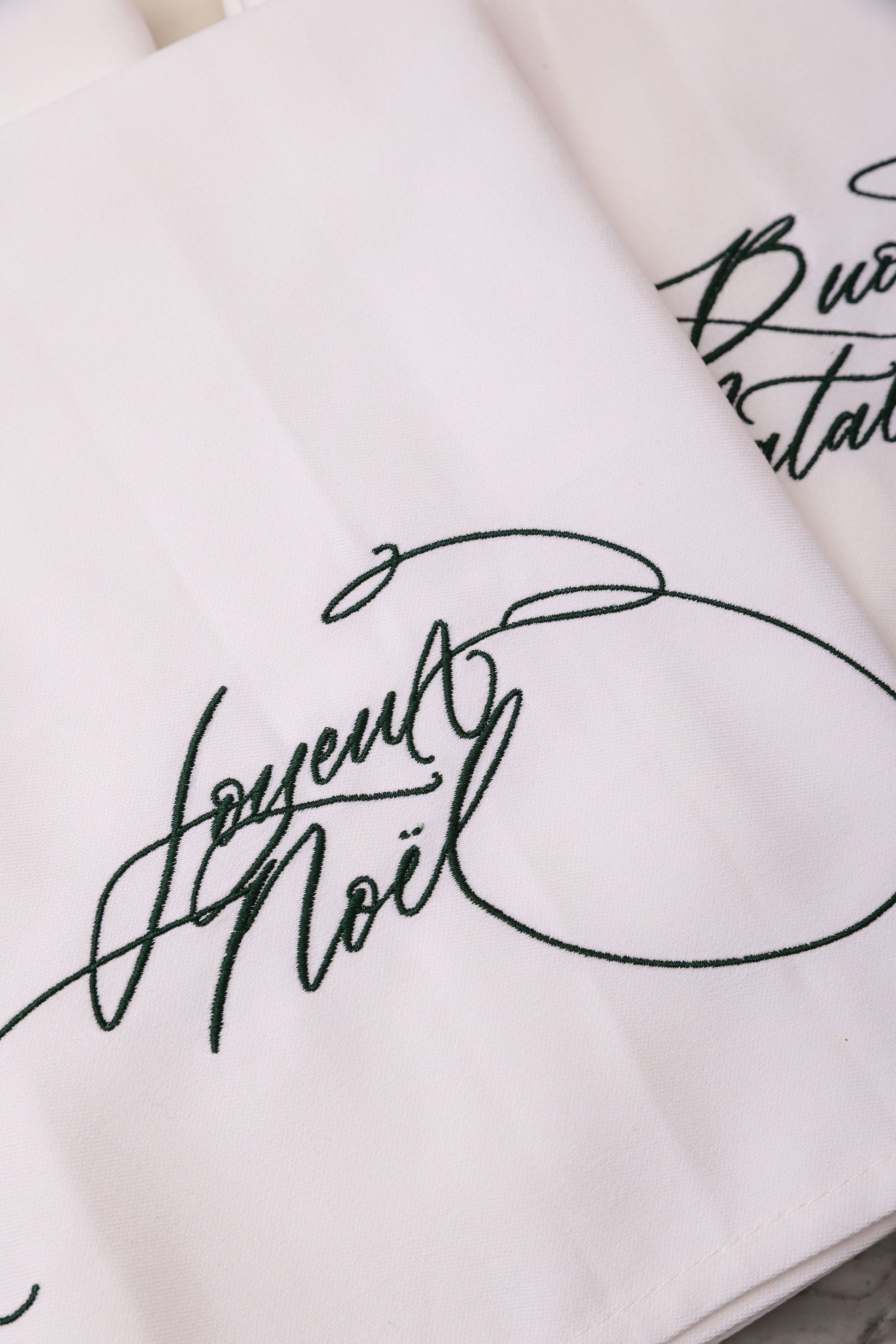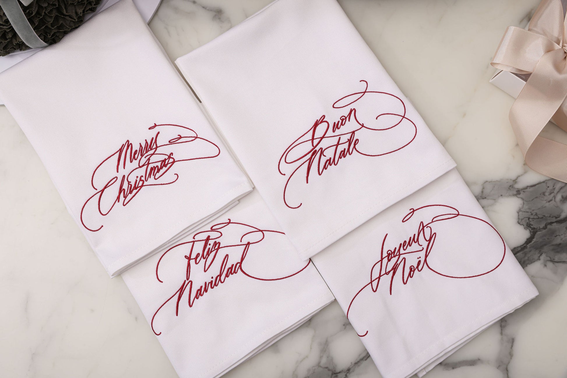 Christmas table celebrations are complete with a set of 4 luxurious calligraphy embroidered napkins in signature hand written calligraphy by Jo Eleanor of Calligraphy en Vogue. "Merry Christmas" In 4 languages to celebrate the coming together of the world to celebrate one of the most important and traditional days.