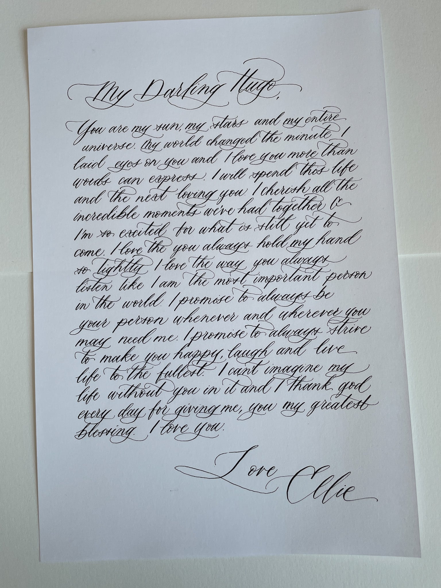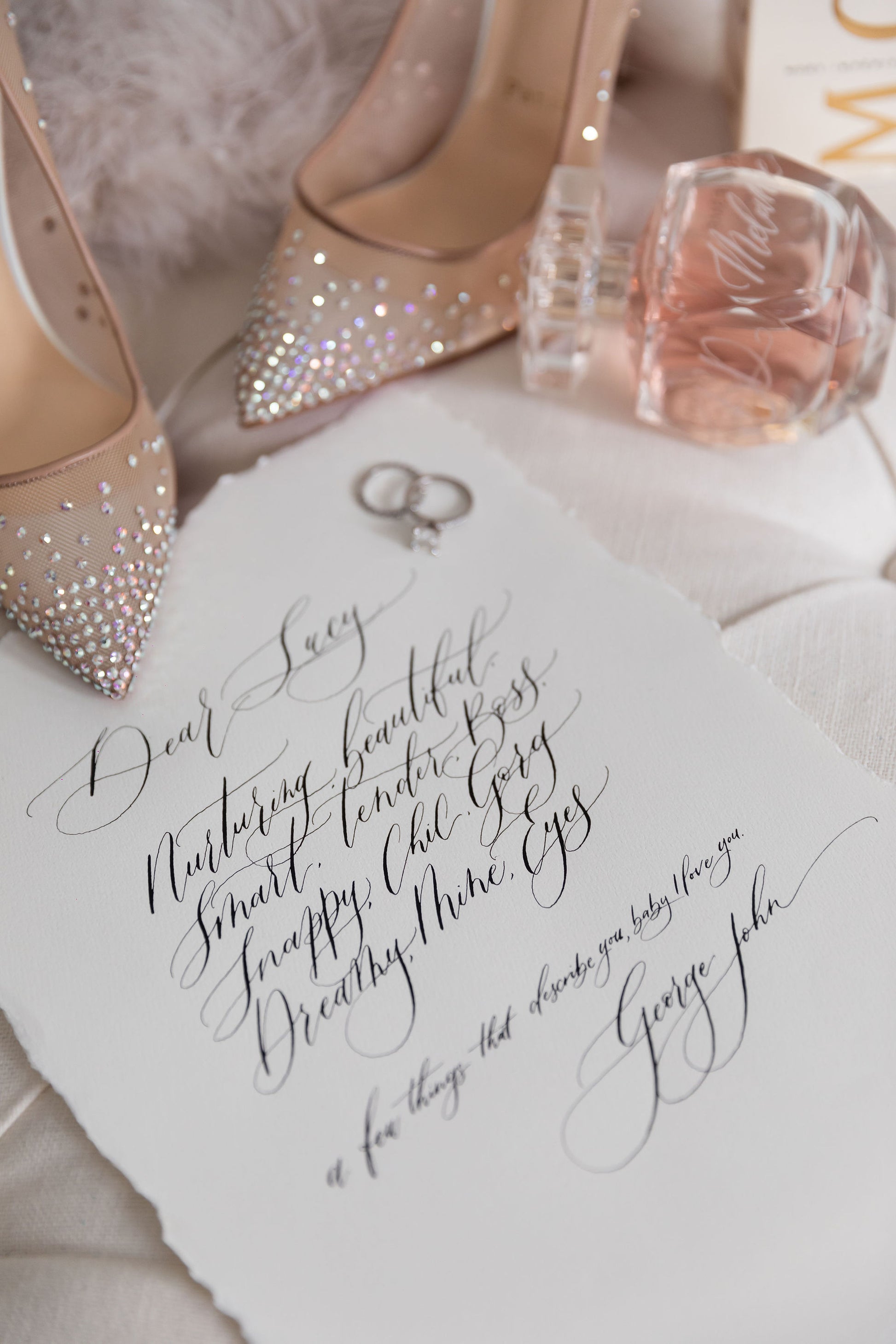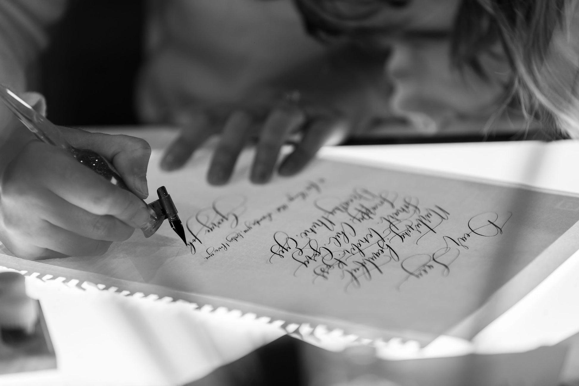 Each letter is exclusively designed and written in pointed pen calligraphy by artist Jo Eleanor of Calligraphy en Vogue.