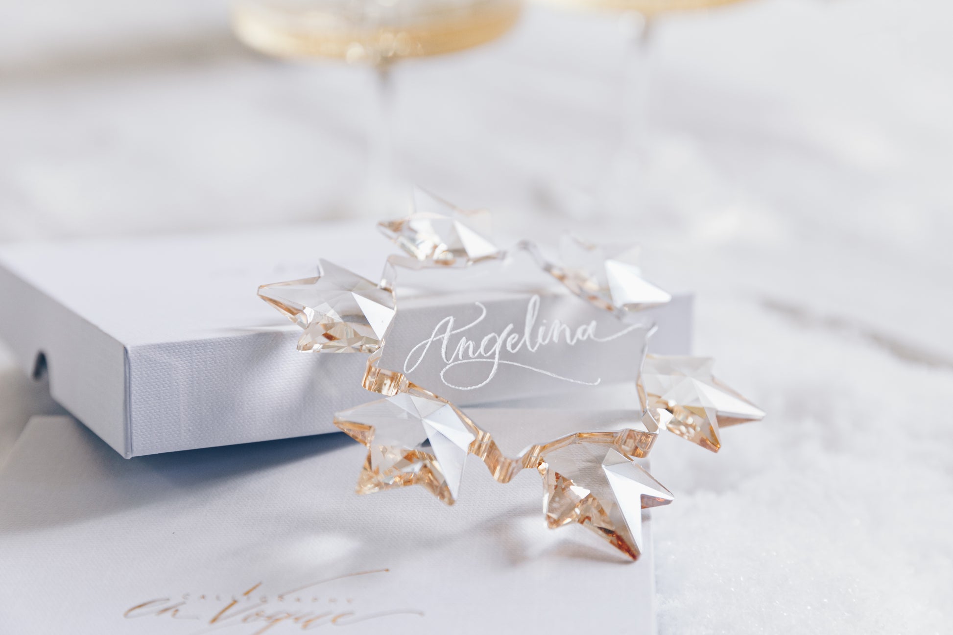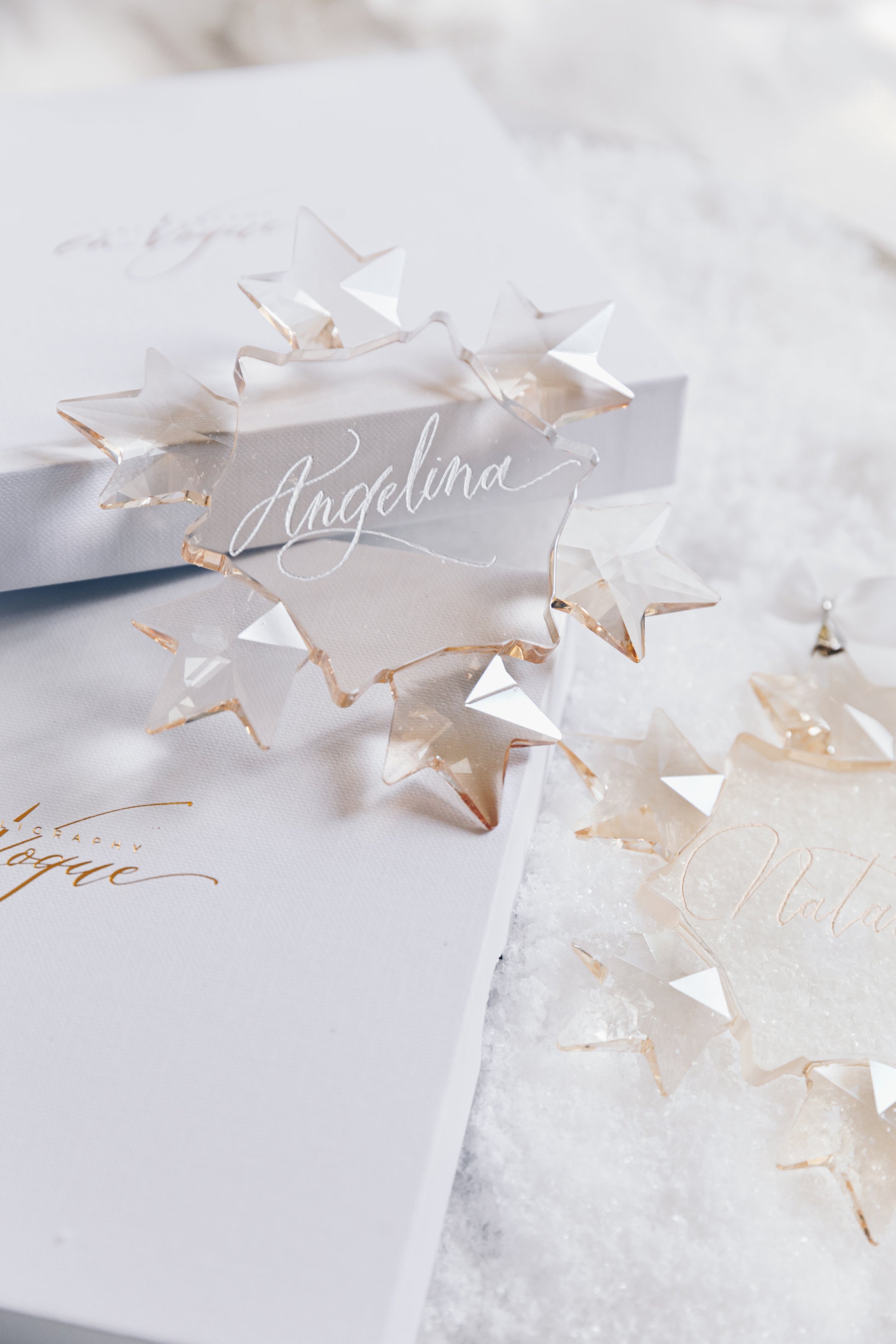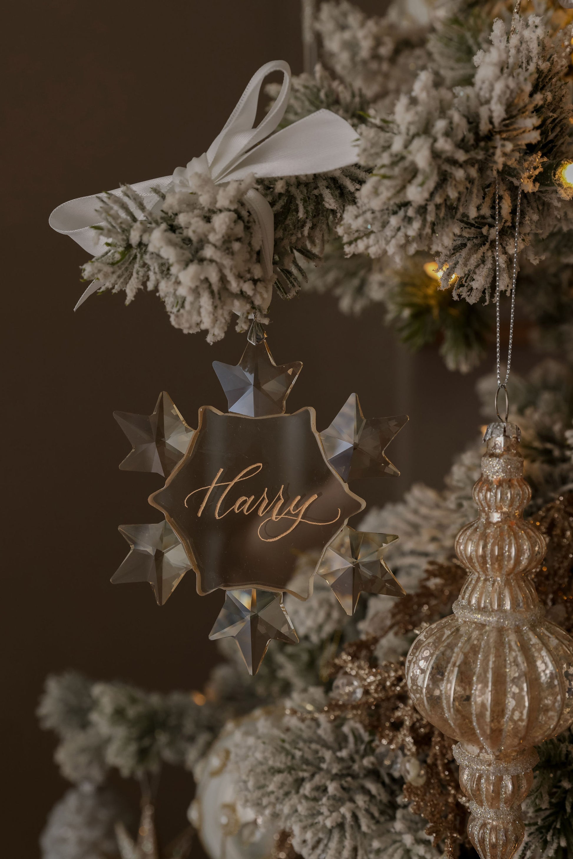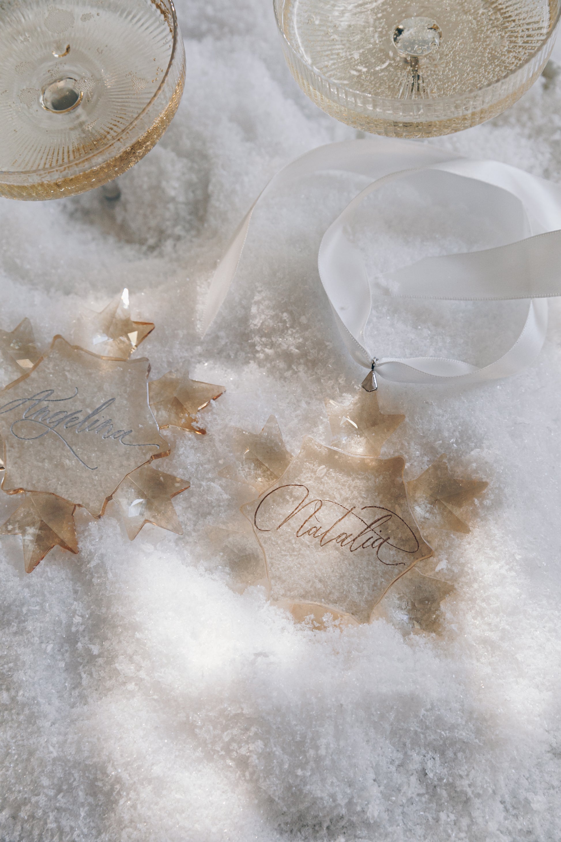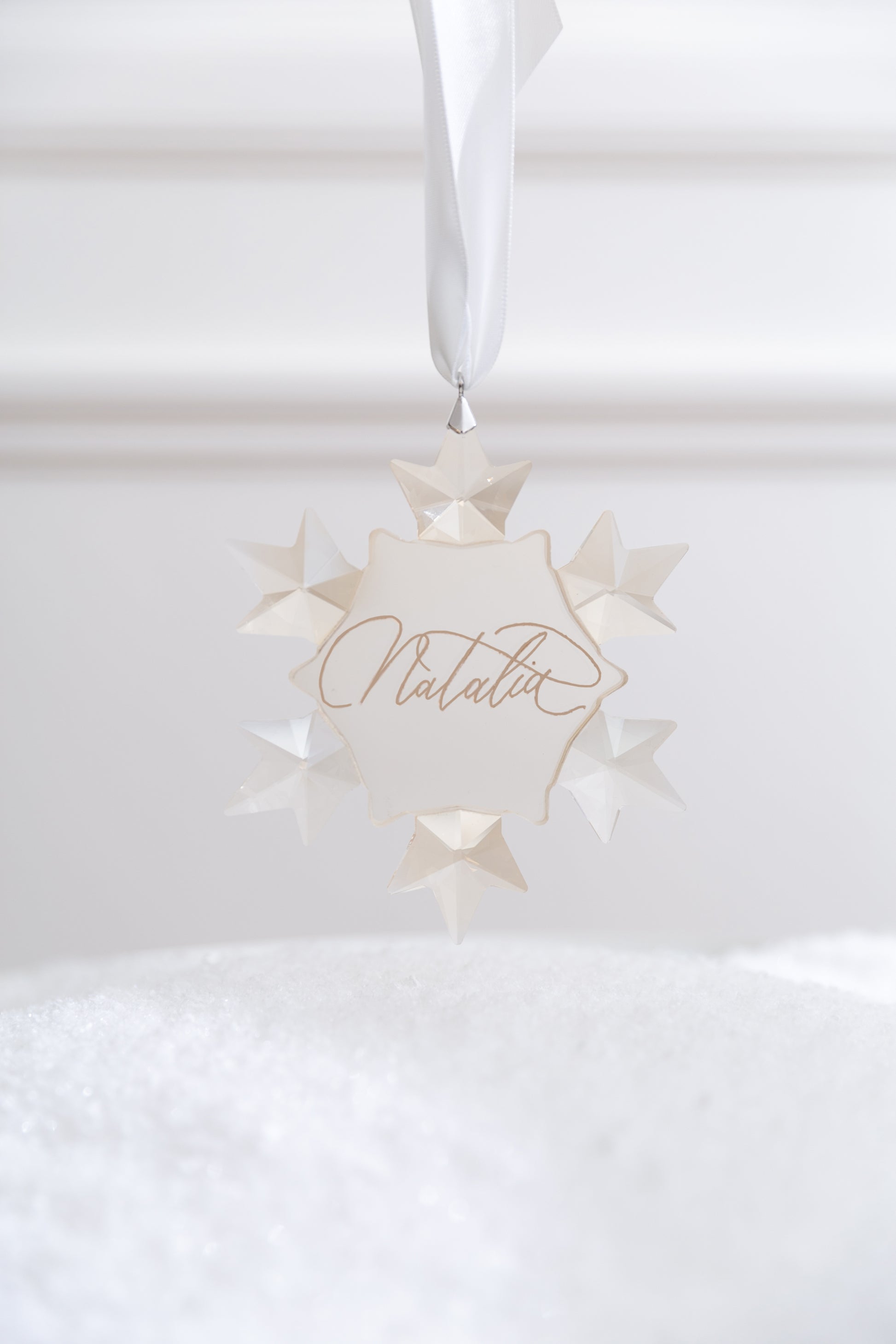 Start a new Christmas tradition. Heirloom Christmas decoration is an exclusive snowflake design, hand engraved by the artist Jo Eleanor of Calligraphy en Vogue in her signature modern calligraphy style. Limited edition Champagne ornament.