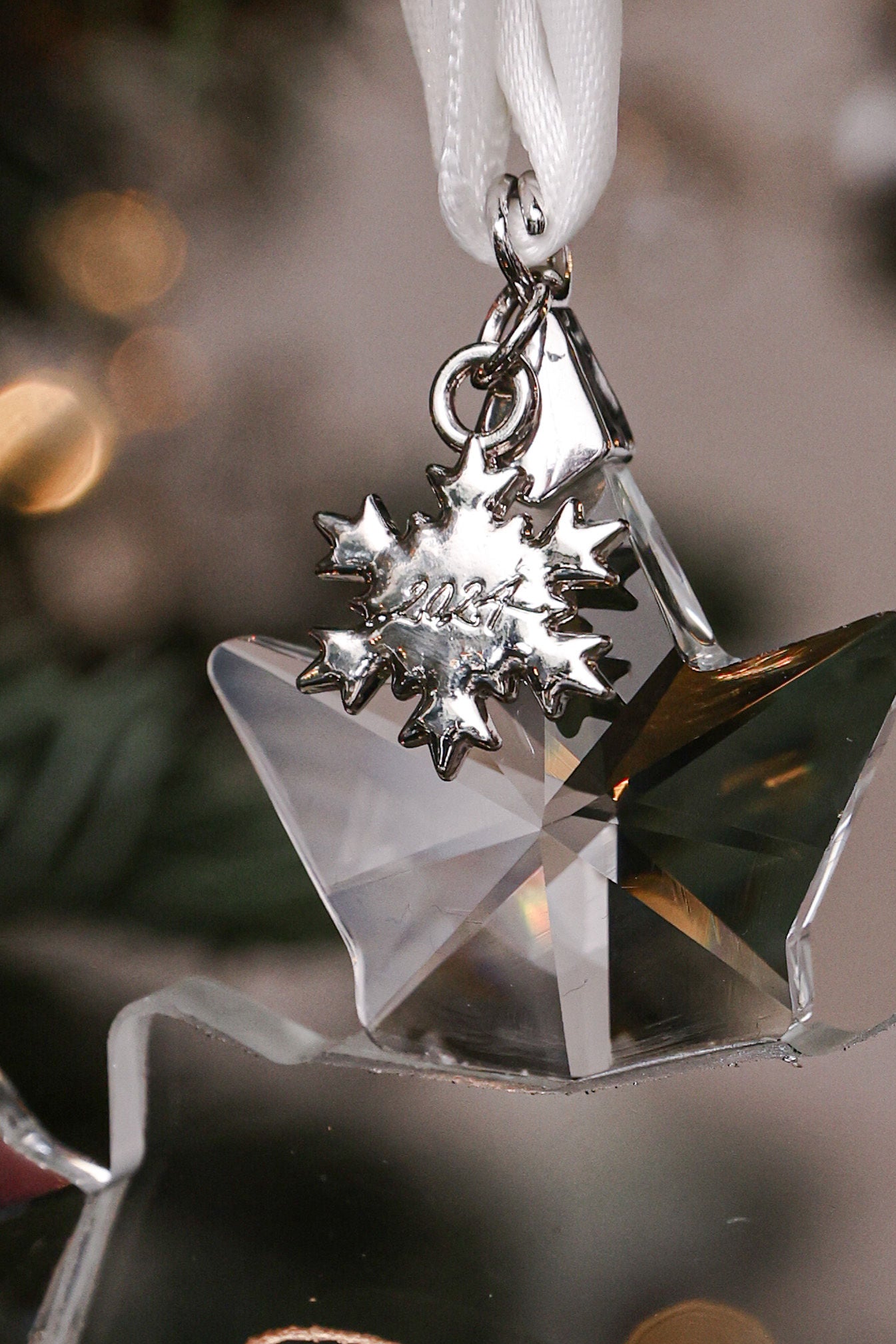 2025 snowflake charm for your heirloom snowflake decorations. (*your item will be a 2025 charm, only 2024 is shown in the images) Now you can make the year your ornament was purchased part of the keepsake design of your ornament. No need to engrave the year on your ornament. Designed to fit all of our crystal heirloom ornaments.